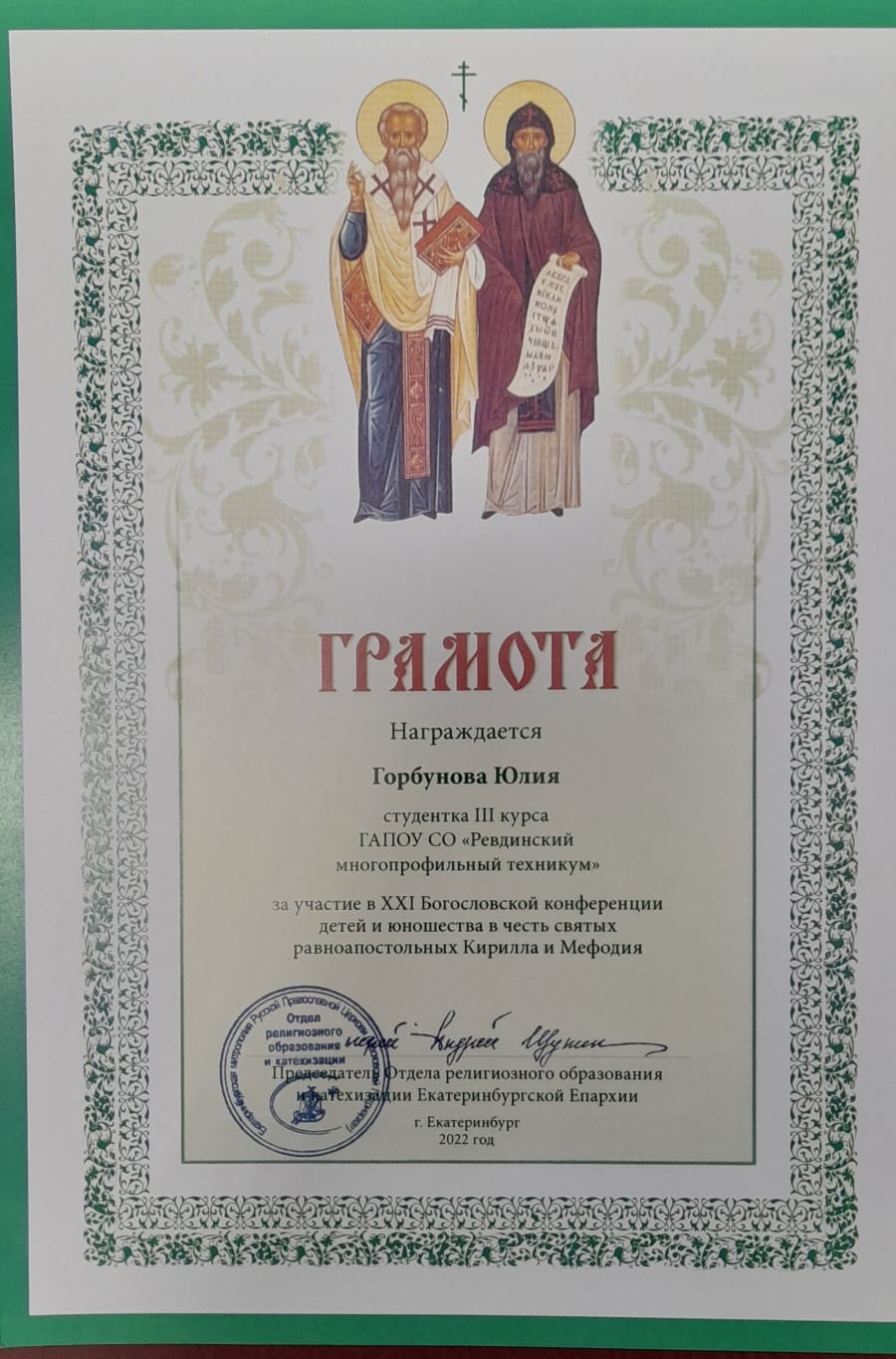 31 мая 2022 года в Свято-Симеоновской гимназии города Екатеринбурга прошла XXI Областная Богословская конференция детей и юношества в честь святых равноапостольных Кирилла и Мефодия «Урал: от Петра I до наших дней». В ней приняли участие ученики воскресных и общеобразовательных школ, образовательных организаций Свердловской области, представившие свои рефераты и проектные работы.