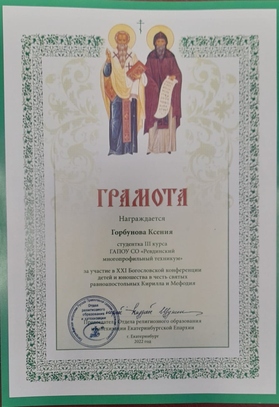 Студентки 3 курса по специальности «Право и организация социального обеспечения» Горбунова Ксения и Горбунова Юлия приняли участие в круглом столе «История: от первых христиан до наших дней», где представили доклад «и небо становится ближе… (о прославлении святого праведного Симеона Верхотургского)».